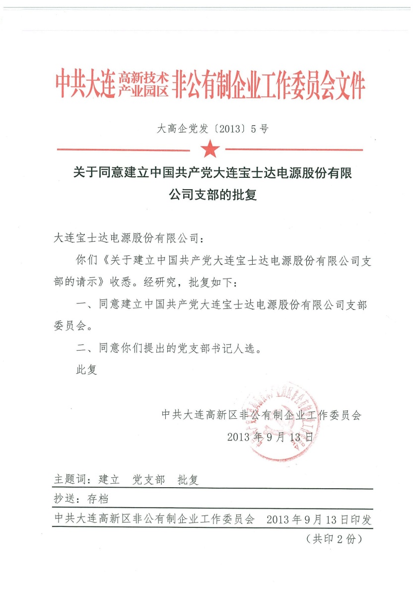 2013年9月13日,關于建立中國共產黨大連寶士達電源股份有限公司支部的請示已批復,同意建立中國共產黨大連寶士達電源股份有限公司支部委員會,隸屬于中共大連高新區非公有制企業工作委員會。