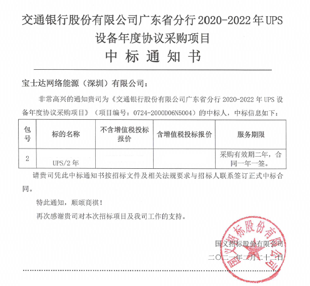 近日,在剛剛結(jié)束的交通銀行廣東省分行UPS系統(tǒng)選型中,憑借創(chuàng)新技術(shù)設(shè)計(jì)理念,寶士達(dá)成為交通銀行廣東省分行UPS系統(tǒng)應(yīng)用的主要品牌之一,拓展了寶士達(dá)在金融領(lǐng)域的應(yīng)用范圍。