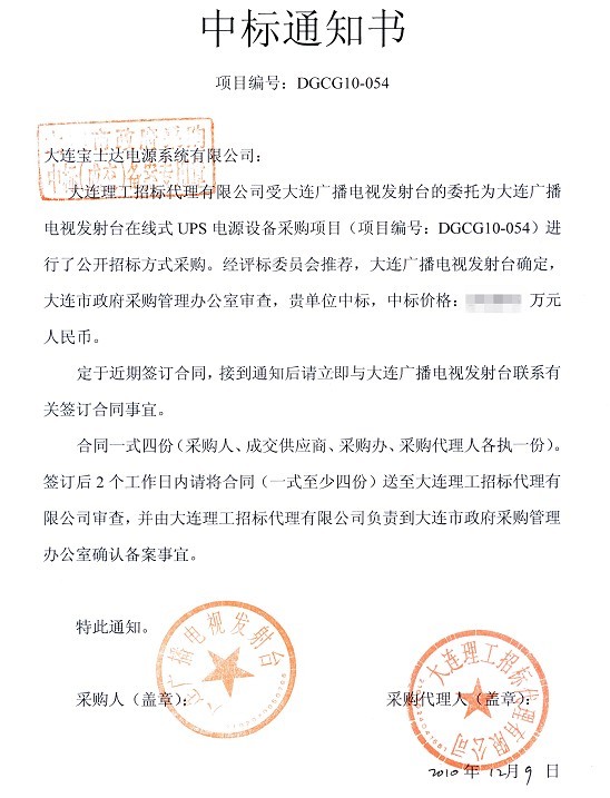近日,大連廣播電視發射臺在線式UPS電源設備采購項目公開招標,此次招標,從產品的性能、供應商的綜合實力、售后服務能力、品牌影響力等方面對競標企業及產品進行了嚴格的篩選。寶士達憑借豐富的電源行業應用經驗、專業的產品質量和優質的服務保障,以絕對優勢一舉中標。