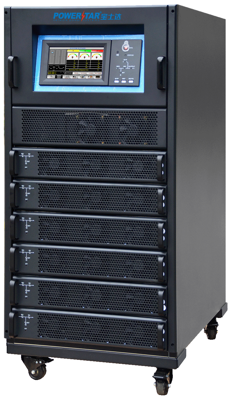 PowerStar’s MR series rack-mounted UPS (modular uninterruptible power supply) is a kind of highly reliable product designed to satisfy the higher demands of the power system. With unique online double-conversion structure, it operates in a three-phase input and three-phase output manner. All the power semiconductor devices adopt imported integrated modules, thus making the system much more reliable. This power system, made up by multiple power modules in parallel connection, operates when there is no master synchronization, and has achieved N+X parallel redundant backup, thus greatly improving the system reliability. Besides, the power system, equipped with large LCD touch screen, graphic operation interface and intelligent “man-machine” dialogue menu, has perfect self-detection and self-protection functions as well as remote monitoring and supervision functions. The most advanced tri-level technology applied to the rectifier and inverter has enabled the system efficiency to reach up to 95%. Therefore, it is a kind of product with the smallest size, highest efficiency, lowest energy consumption ratio, highest power density and extremely high cost performance in this industry.
