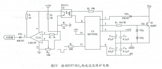 Figure 29 is an over-current protection circuit using the indirect voltage method. it can detect the overcurrent of IGBT by adopting the principle that the value of UCE will increase when overcurrent occurs,. .The internal circuit of M57959AL drive can successfully complete soft shut. UCE containing current information can fastly recover the test of diode VD2, and then directly transmits to the M57959AL’s collector voltage monitoring terminal 1, pin 8 output; It will then be sent to reference voltage of comparator U1A’s positive end and reverse side through the U2 photoelectric coupler. After comparison, ouput is made and drive signal can be turned off. If over-current emerges, drive M57959AL will slowly cut off IGBT, to avoid damages caused by r voltage spike due to large di/dt , and reduce the noise level.