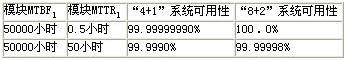 根據(jù)上述公式可以計算出在MTBF1=5萬小時,MTTR1=0.5小時時的“4+1”和“8+2”系統(tǒng)的可用度為: