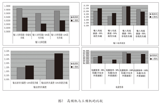 The rectifier part of the UPS according to the different design of the operating frequency of the circuit can be divided into high frequency machine and power machine. High frequency machine adopts the high frequency of the PWM and microprocessor control technology, the power machine adopts the principles of analog circuits. Except for the difference between the volume and weight, the index parameter also different, figure 2 shows the input power factor, input current harmonics, the output waveform distortion, power efficiency and other parameters of the statistical data, the external filter frequency of power machine decline in the efficiency of about 1%.They should be selected according to the needs of customers, the installation environment, load balance and other conditions.