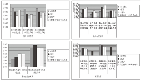 The working principle of UPS rectifier can be divided into IGBT rectifier, 6 pulse mode, 12 pulse mode and controlled rectifier +IGBT boost circuit, figure 3 shows the various rectifier mode UPS in statistical number, full of light load, resistive load, nonlinear load conditions the four parameter, different operating principle of the UPS makes a great difference in output parameters .