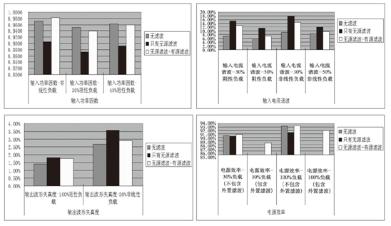 UPS Filter have a great effect on the technical indicators, figure 4 shows the statistical data when the UPS in the conditions of full load, light load, resistive load, nonlinear load with three modes of no filtering, only the passive filter and the passive filter+ active filter.